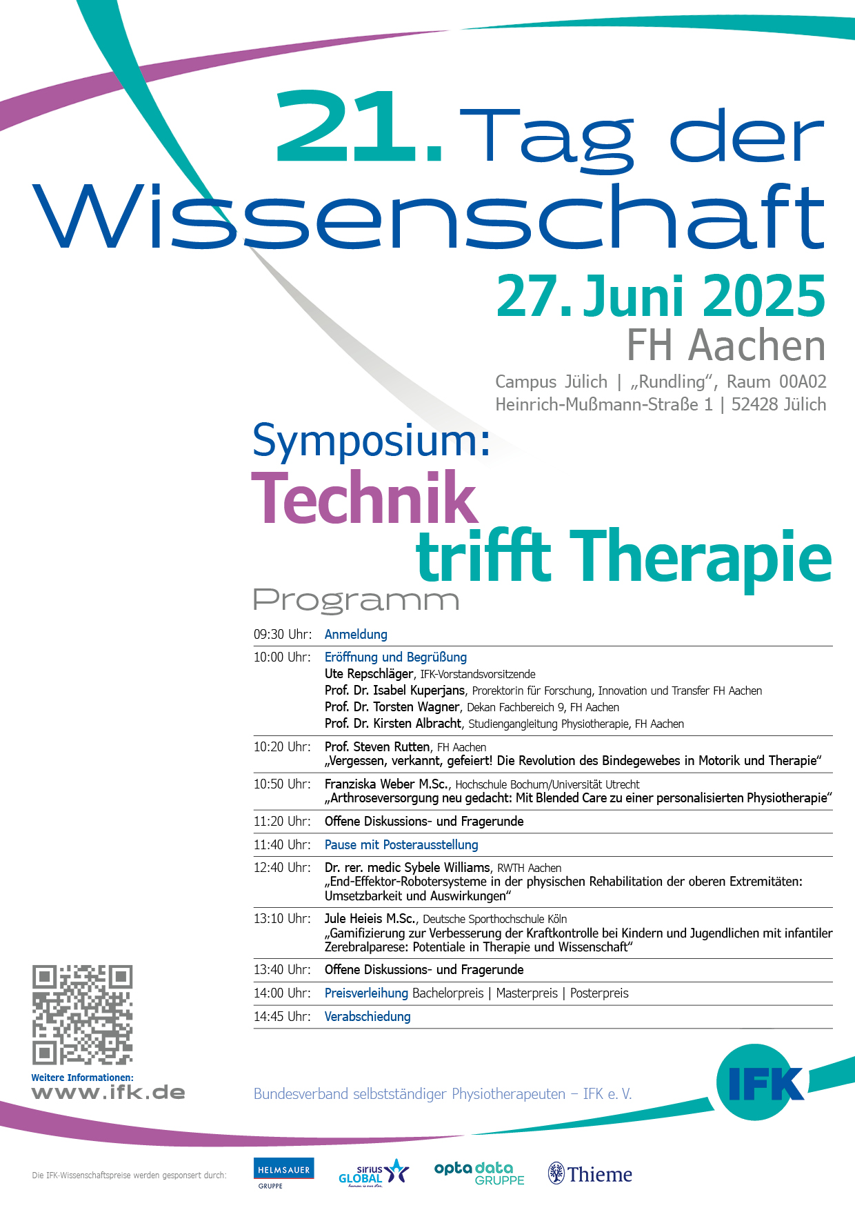Am 27. Juni ist es wieder so weit: Der IFK-Tag der Wissenschaft geht in die 21. Runde – diesmal in Kooperation mit der Fachhochschule Aachen auf dem Campus Jülich. Unter dem Motto „Technik trifft Therapie. Neue Perspektiven in der physiotherapeutischen Versorgung“ erwartet die Teilnehmenden ein spannendes Programm rund um aktuelle Forschung und innovative Entwicklungen in der Physiotherapie.