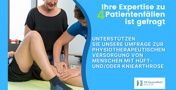 Der Studienbereich Physiotherapie der Hochschule für Gesundheit Bochum führt aktuell eine Studie zur Qualität der physiotherapeutischen Versorgung von Menschen mit Hüft- und/oder Kniearthrose in Deutschland durch. Dazu werden noch Physiotherapeuten gesucht, die bereit sind, mit ihren Erfahrungen zu diesem Thema die Studie mittels einer Online-Befragung zu unterstützen.