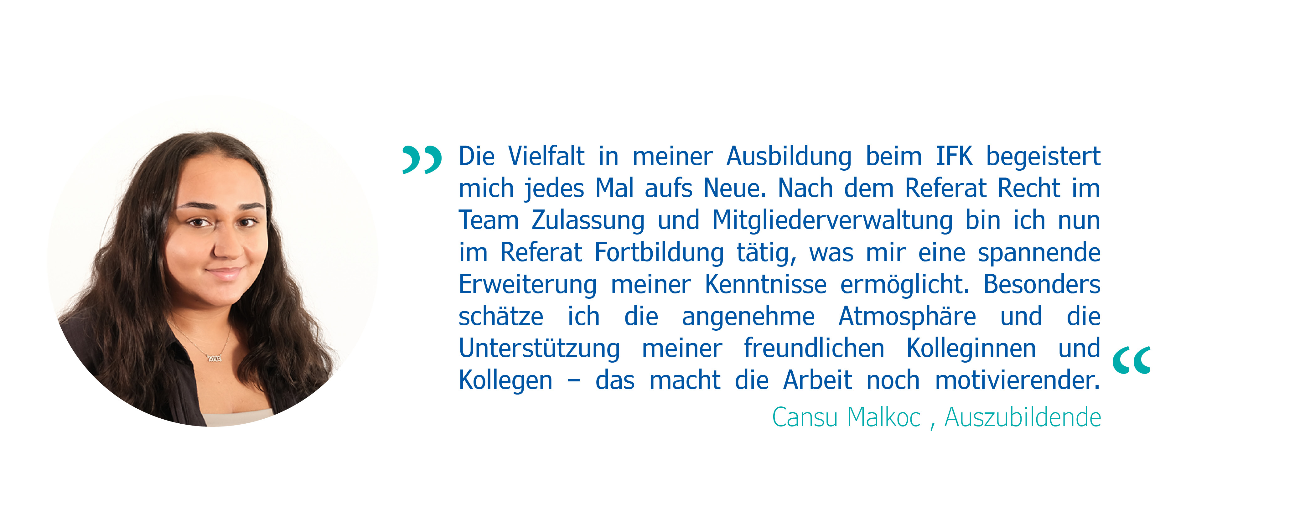 Während der dreijährigen Ausbildung mit IHK-Abschluss machen wir Dich Schritt für Schritt fit für Deine neue Herausforderung. Du lernst in unseren verschiedenen Referaten ganz unterschiedliche Aufgabenbereiche kennen – zum Beispiel die Bearbeitung von Zulassungsanträgen, das Kundenmanagement im Fortbildungsbereich, Aspekte der Abrechnung mit den Krankenkassen und buchhalterische Aufgaben. Dabei übernimmst Du schnell und selbstständig eigene Tätigkeiten und unterstützt unser Team in der Mitgliederberatung. Aber keine Angst: Es ist natürlich immer jemand bei Dir, der Dir bei Fragen weiterhelfen kann.