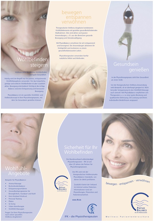 Der IFK hat für seine Mitglieder ein Marken-Wellness-Konzept geschaffen, welches jederzeit problemlos in jede Physiotherapiepraxis integriert werden kann. Die IFK-Wellnessmarke „PhysioBalance" sorgt für die richtige Balance zwischen Entspannung und bewusster Bewegung. Ihre therapeutischen Wellness-Angebote kombinieren Wohlfühlelemente mit gezielten gesundheitsfördernden Maßnahmen. Der IFK bietet für Interessenten entsprechende Fortbildungen zu den Bereichen RückenYoga und Qi Gong/Taiji in der Physiotherapie an (Details finden Sie hier.)